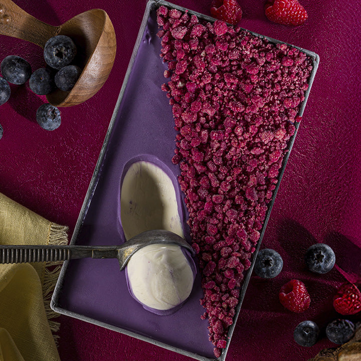 Γαρνίρεται με τραγανό crumble σμέουρου με έντονο κόκκινο χρώμα.